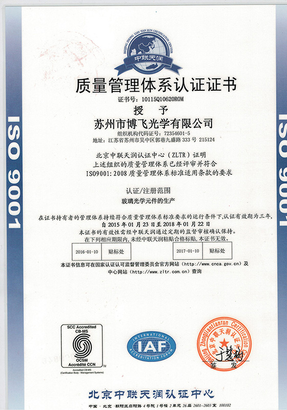 博飛光學通過ISO9001質量管理體系自2008年開始進行質量管理體系認證。我們建立了嚴格的質量管理體系,嚴格控制產品質量,確保每一件產品都符合國際標準,能夠提供優(yōu)良的光學性能。